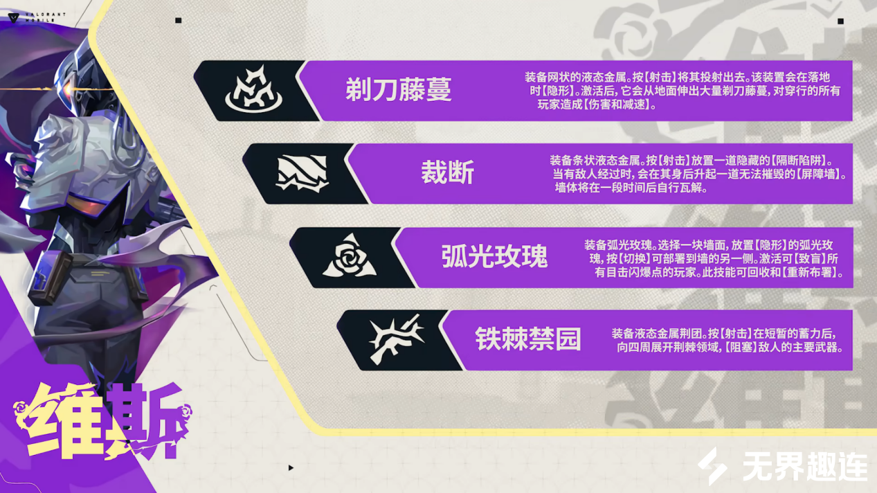 无畏契约维斯是哨卫型角色,擅长用液态金属布置陷阱掌控战局。C技能剃刀藤蔓投射后隐形,触发可造成伤害与减速;E技能弧光玫瑰可贴墙部署隐形闪爆器,能回收重放致盲敌人;Q技能裁断可设隐藏屏障,阻挡敌方推进;大招铁棘禁园能展开领域,阻塞敌方主武器。想随时用手机体验这份乐趣,无界趣连2.0可实现远程串流,轻松打破设备束缚。