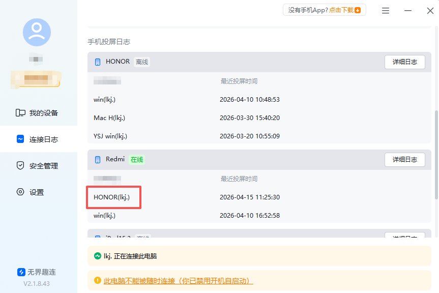 无界趣连2.0注重每一次远程连接的安全性,贴心设置了完整的连接日志功能。每次手机控制手机的连接记录、操作时长、具体操作类型,都会详细留存,方便用户随时追溯查看。不管是担心误操作,还是想管理设备连接记录,只需简单几步就能调出日志,清晰掌握每一次远程操控情况,隐私与安全双重保障。